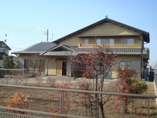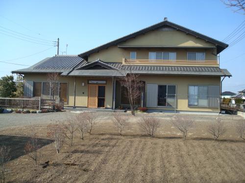 北西側から見た風景。2F建部分と平屋建部分の間には庭園が広がっています。